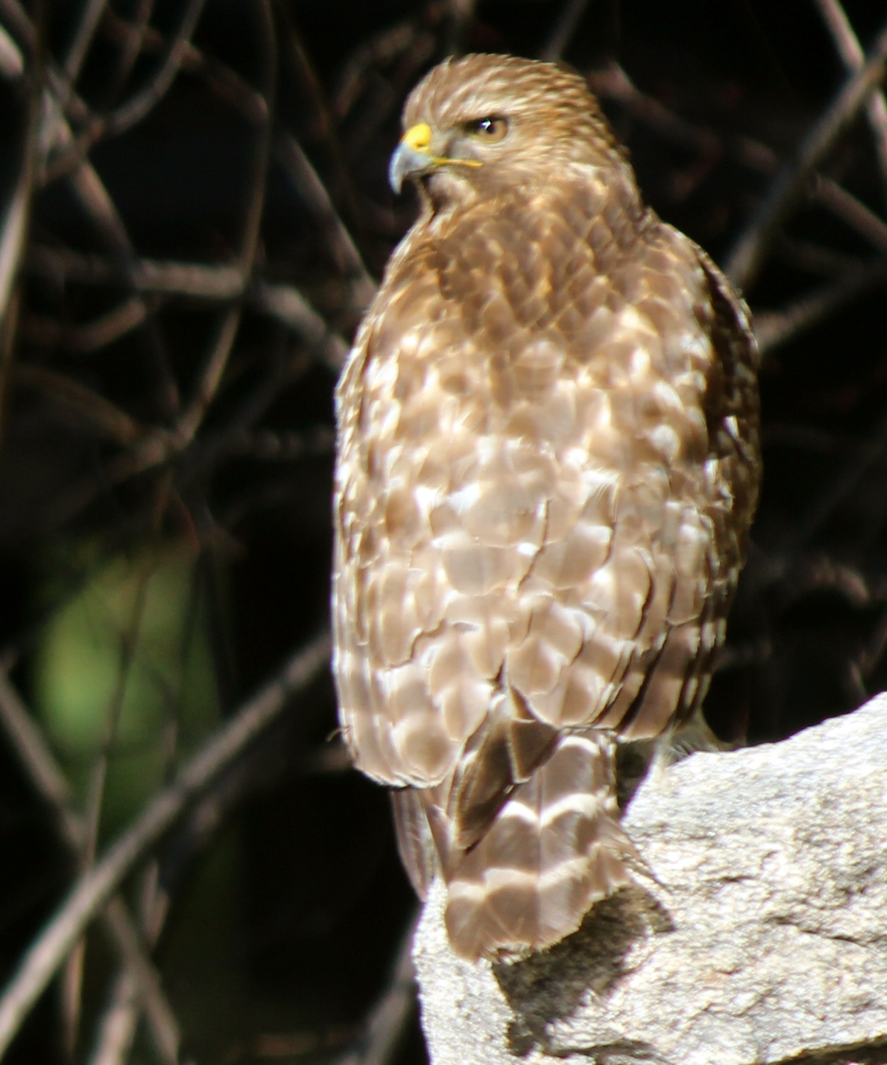 A hawk looks over the neighborhood from the steps of a cabin called the Forty-Niner because 49 steps lead to the front porch.
